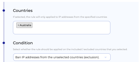 - Ban IP addresses from the selected countries (inclusion)