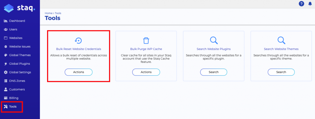 Whether you have 2, 10, or 1,000 websites hosted on Staq, Staq has a neat tool that with a click of a button, it’ll reset the password related to your agency’s username in 1 click.