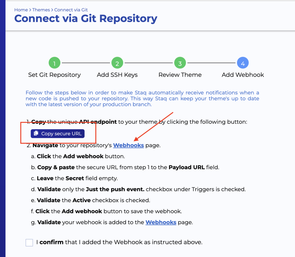In the last step, click Copy secure URL and then click Webhooks: