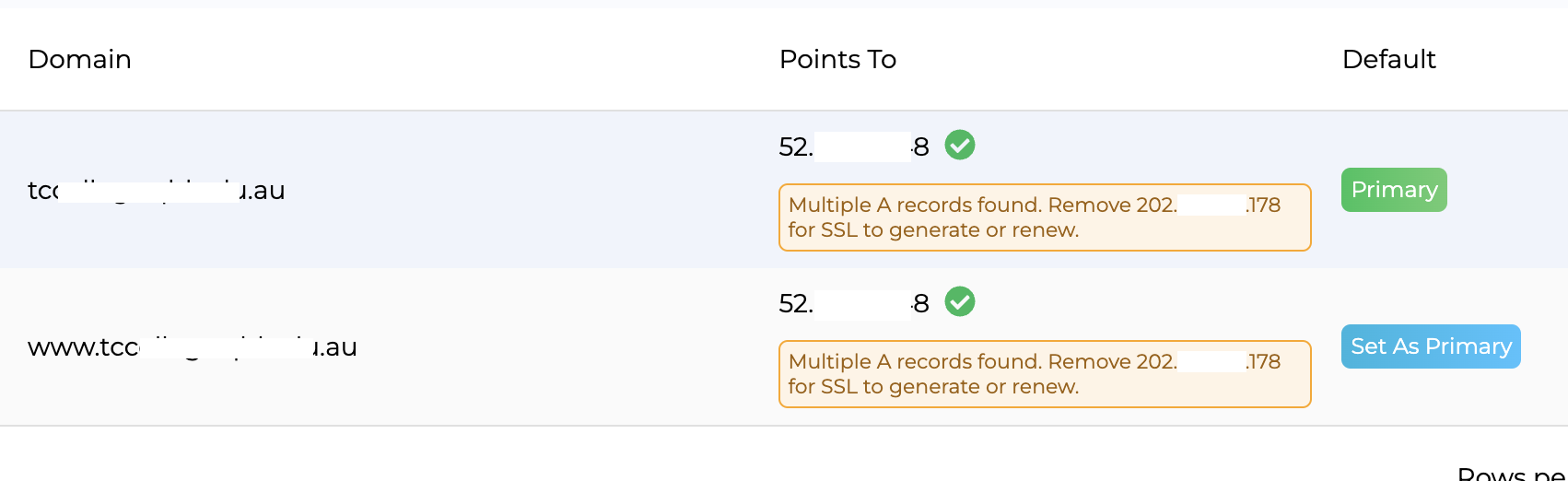 If you have 2x or more A records, delete the unnecessary one that does not point to Staq. This will prevent the SSL generation process. To see if this is the case, go to Staq Panel > Domains and see if a warning appears, similar to this where it tells you “Multiple A records found. Remove <IP Address> for SSL to generate or renew:
