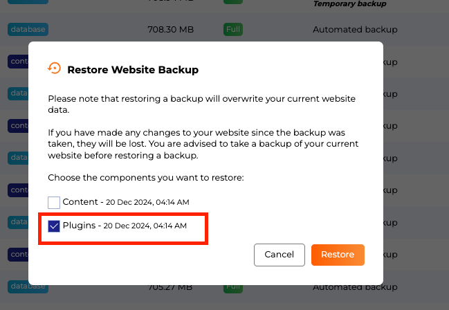 Then a popup will open. Select i.e. Plugins followed by Restore: