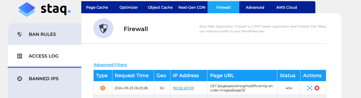Managing access to your WordPress site is crucial for maintaining security and performance. Staq Firewall provides tools to ban IP addresses that pose a threat or engage in malicious activity. This guide will walk you through the steps to identify, ban, and manage IP addresses using the Staq Firewall.