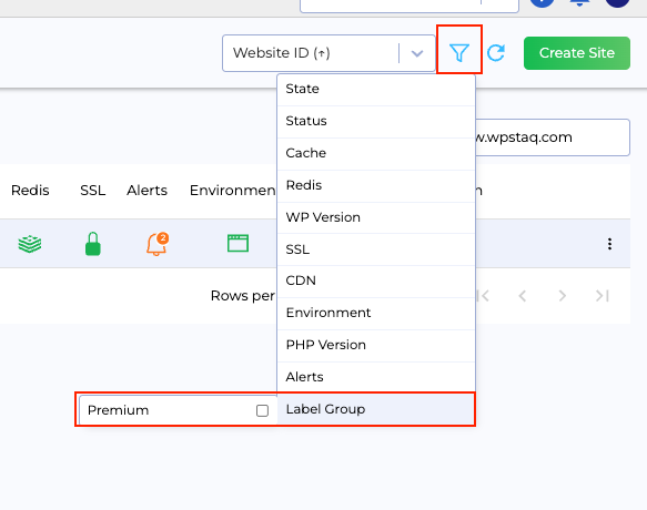 To filter websites based on labels, use the filter option in the Websites table. Select Label Group and choose the desired label to narrow down results: