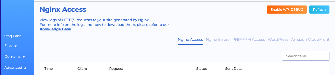 php-fpm.access.log. - WordPress Logs: Available when the debugger is enabled from the Staq > Debug page, logged in