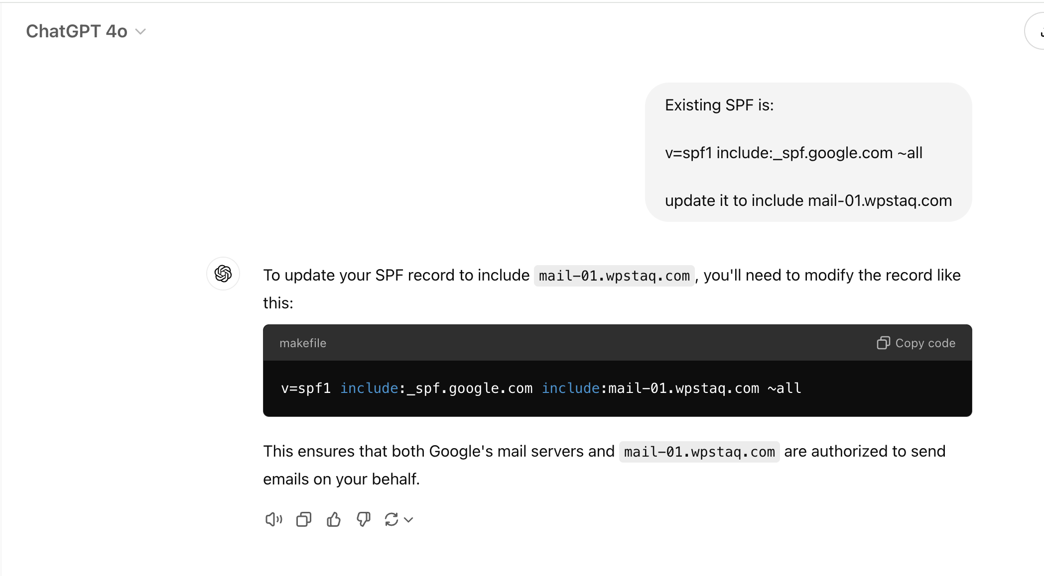 If you’re unsure on how to update your SPF record, it’s recommended that you use an AI tool like ChatGPT. For example, you can see the command below on how it updated an existing SPF record:
